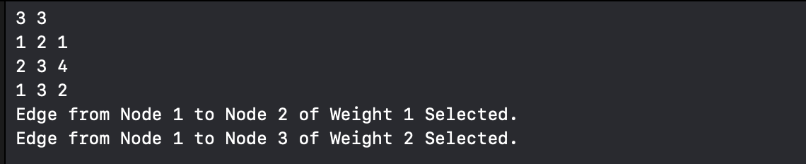 printf("Edge from Node %d to Node %d of Weight %d Selected. \n", y.a, y.b, y.w);