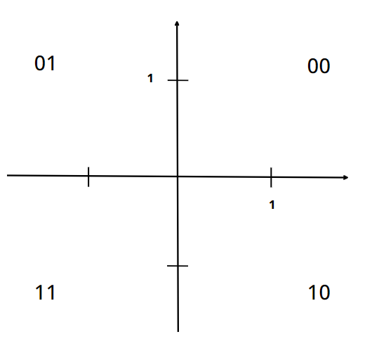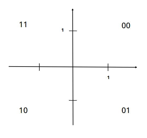 과 같이, 위상 변화를 90씩 주어 4개 종류의 디지털 심볼로 전송하는 4진 PSK 방식이다
