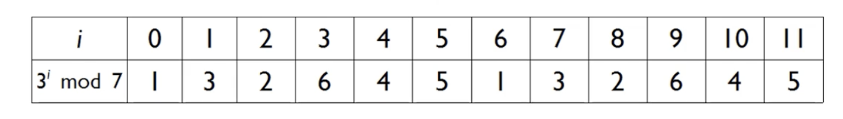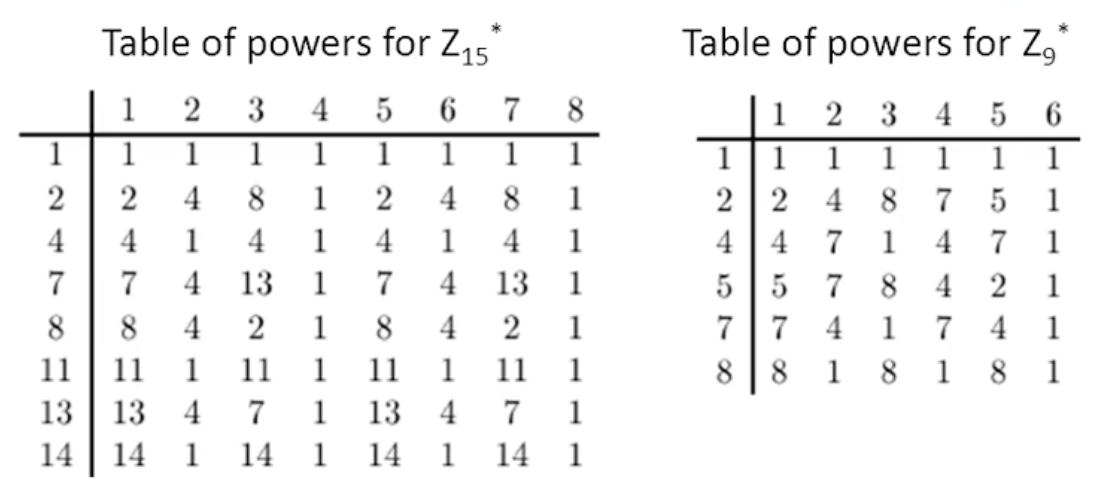 - If \(ord_n(g)\) = \(|Z^*_n|\), then every element in \(Z^*_n\) is a power of g modulo n