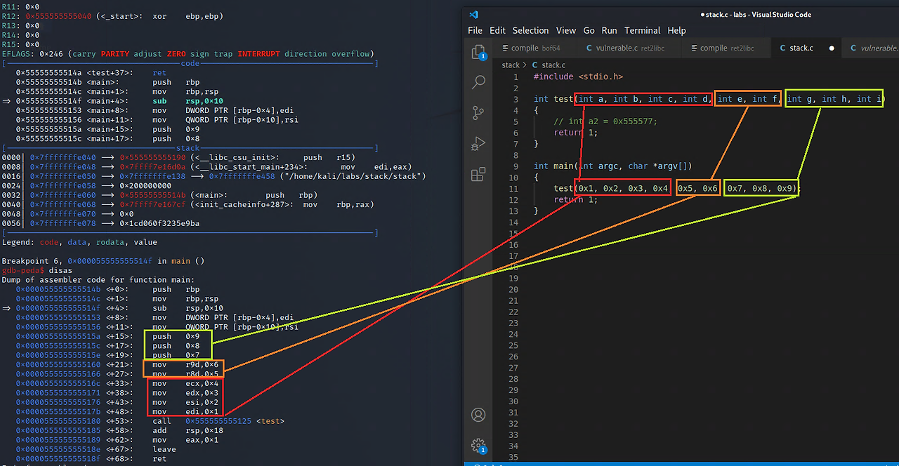 In 64-bit Linux system, function arguments of type integer/pointers are passed to the callee function in the following way: This lab and conclusions are based on the following C program compiled on a 64-bit Linux machine: Let's now see how arguments are pa
