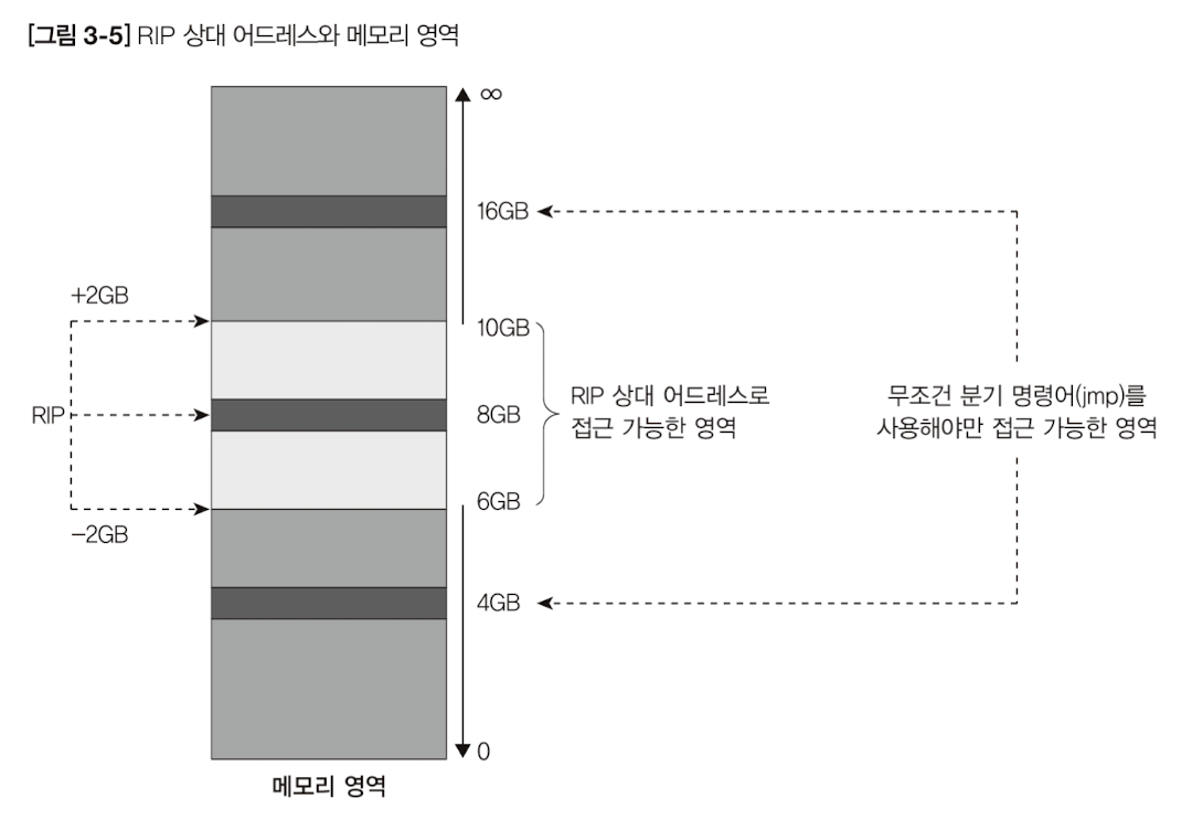 RIP 레지스터 + 32비트 오퍼랜드 -> 64비트 주소 공간을 나타낼 수 있음