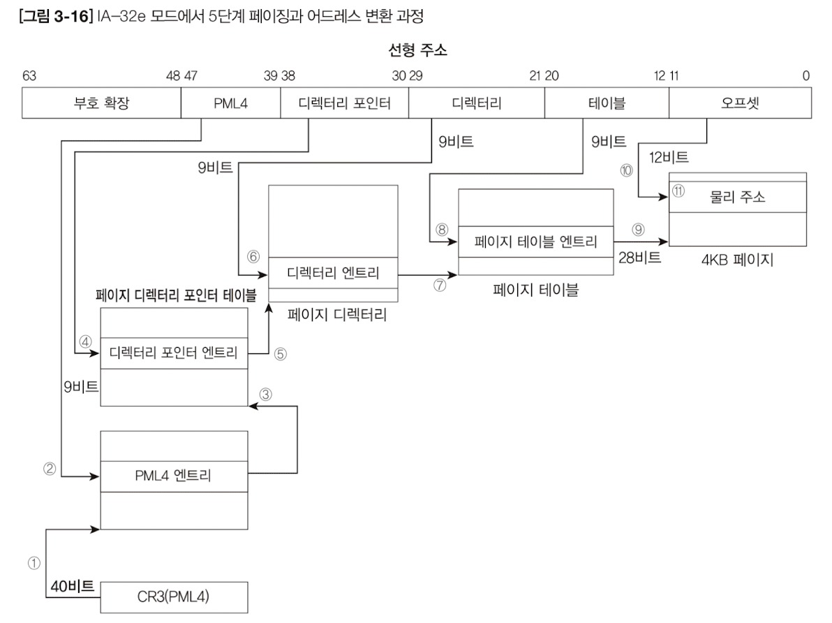 IA-32e 모드의 페이징은 보호 모드와 달리 주소 공간이 64비트로 늘어나므로 PAE 기능이 활성화된다.