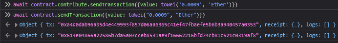처음 contribute함수를 실행하여, 0.0009만큼의 이더를 보낸다.