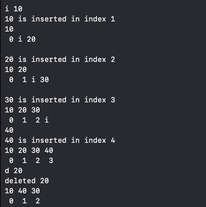 - item의 개수를 표시하는 변수가 따로 필요함 : 한 쪽에 데이터가 몰려있기 때문에 유의미한 데이터의 개수를 세주면, 그것이 유효한 배열의 size라고 볼 수 있다.
