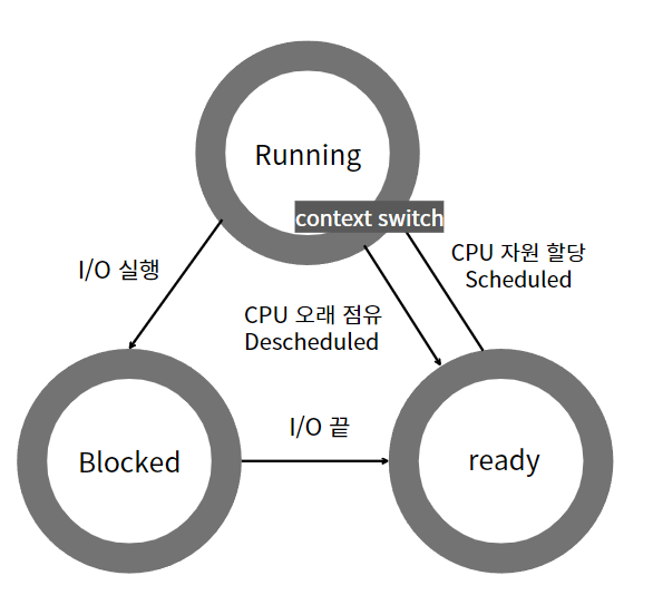 - Blocked (Waiting) : cpu를 할당받아도 아무것도 안하는 상태 (데이터의 입력을 기다리는 등) / 프로세스가 cpu를 할당받아도 작동할 준비가 되어있지 않음